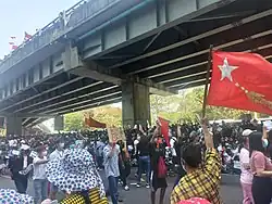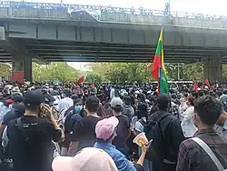 Le , 100 000 manifestants à Minbu (en), représentant une coalition diversifiée d'hindous, de musulmans, d'ouvriers des champs pétrolifères et de fonctionnaires, se sont rassemblés pour protester leur opposition au coup d'État et soutenir la libération de politiciens élus par les civils.