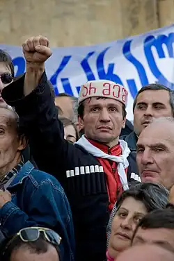 Le 2 novembre 2007, des dizaines de milliers de Géorgiens manifestent devant le parlement de la capitale, Tbilissi, exhortant le président Mikhail Saakachvili à démissionner. La foule appelle également à des élections législatives anticipées. Ils accusent Saakachvili de diriger un gouvernement corrompu et autoritaire et veulent qu'il soit évincé démocratiquement[28].