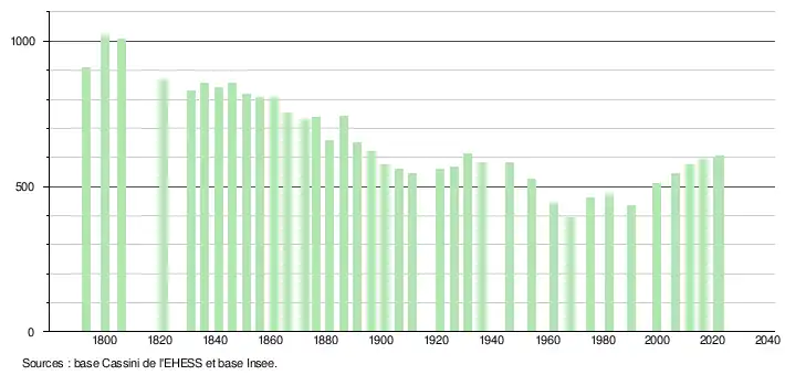 L'évolution du nombre d'habitants est connue à travers les recensements de la population effectués dans la commune depuis 1793. Pour les communes de moins de 10 000 habitants, une enquête de recensement portant sur toute la population est réalisée tous les cinq ans, les populations de référence des années intermédiaires étant quant à elles estimées par interpolation ou extrapolation[18]. Pour la commune, le premier recensement exhaustif entrant dans le cadre du nouveau dispositif a été réalisé en 2006[19].