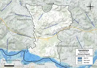 La commune fait partie du territoire à risques importants d'inondation (TRI) de Tulle-Brive, regroupant 20 communes concernées par un risque de débordement de la Corrèze et de la Vézère (17 dans la Corrèze et trois dans la Dordogne), un des 18 TRI qui ont été arrêtés le 11 janvier 2013 sur le bassin Adour-Garonne[15]. Des cartes des surfaces inondables ont été établies pour trois scénarios : fréquent (crue de temps de retour de 10 ans à 30 ans), moyen (temps de retour de 100 ans à 300 ans) et extrême (temps de retour de l'ordre de 1 000 ans, qui met en défaut tout système de protection)[16]. La commune a été reconnue en état de catastrophe naturelle au titre des dommages causés par les inondations et coulées de boue survenues en 1982, 1983, 1999 et 2001[17],[13]. Le risque inondation est pris en compte dans l'aménagement du territoire de la commune par le biais du plan de prévention des risques (PPR) inondation « Vézère », approuvé le [18].