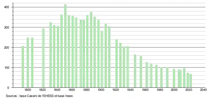 L'évolution du nombre d'habitants est connue à travers les recensements de la population effectués dans la commune depuis 1793. Pour les communes de moins de 10 000 habitants, une enquête de recensement portant sur toute la population est réalisée tous les cinq ans, les populations de référence des années intermédiaires étant quant à elles estimées par interpolation ou extrapolation[23]. Pour la commune, le premier recensement exhaustif entrant dans le cadre du nouveau dispositif a été réalisé en 2008[24].