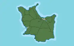 À six kilomètres au nord-ouest de l'île se trouve l'île Dudune, inhabitée.