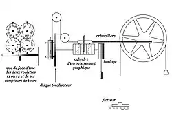 Comment fonctionne le marégraphe totalisateur ? Le câble auquel est attaché le flotteur fait évoluer horizontalement une pièce appelée crémaillère (une barre horizontale entraînant les aiguilles qui traçaient, sur papier, le niveau instantané de la mer). Le papier d’enregistrement (le marégramme) est déroulé par un cylindre dont la rotation est régulière (il est mu par une horloge). Le totalisateur est un intégrateur mécanique. Son mécanisme se compose d’un chariot porte-roulettes porté par deux perches verticales et d’un disque vertical en verre disposé sur le même axe que le cylindre d’enregistrement (et qui tourne à la même vitesse). Le chariot est relié à l’extrémité de la crémaillère par un mince ruban de platine, qui, en s’infléchissant sur deux poulies, transforme le mouvement de va-et-vient horizontal de la crémaillère en un mouvement vertical alternatif de translation (quand le niveau de la mer descend, le chariot monte et inversement).