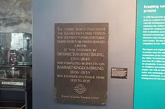 Brunel avait déjà établi des plans pour un tunnel sous la rivière Neva, en Russie, mais le projet n'avait jamais été concrétisé. En 1818, Marc Brunel déposa un brevet pour un système de tunnelier. C'était un bouclier renforcé de fonte derrière lequel les mineurs travaillaient dans des compartiments séparés, creusant le tunnel de face. De temps en temps, le bouclier était avancé par grandes étapes, tandis que les parois du tunnel déjà creusé en arrière seraient recouvertes d'un revêtement constituée d'anneaux de fonte. On prétend que Brunel trouva son inspiration dans la manière d'opérer du taret, Teredo navalis, qui a la tête protégée par une coquille lorsqu'il fore le bois des navires. L'invention de Brunel servit de base pour les boucliers utilisés pour le creusement du métro de Londres et de nombreux autres tunnels. Brunel était si convaincu qu'il pourrait utiliser un tel tunnelier pour creuser un tunnel sous la Tamise qu'il écrivit à toutes les personnes d'influence qui pourraient être intéressées. Enfin, en , une réunion eut lieu et 2 128 actions de 50 livres chacune furent souscrites. En , la Thames Tunnel Company fut constituée. Le tunnel était prévu pour le trafic hippomobile[8].