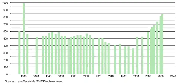 L'évolution du nombre d'habitants est connue à travers les recensements de la population effectués dans la commune depuis 1793. Pour les communes de moins de 10 000 habitants, une enquête de recensement portant sur toute la population est réalisée tous les cinq ans, les populations de référence des années intermédiaires étant quant à elles estimées par interpolation ou extrapolation[20]. Pour la commune, le premier recensement exhaustif entrant dans le cadre du nouveau dispositif a été réalisé en 2004[21].