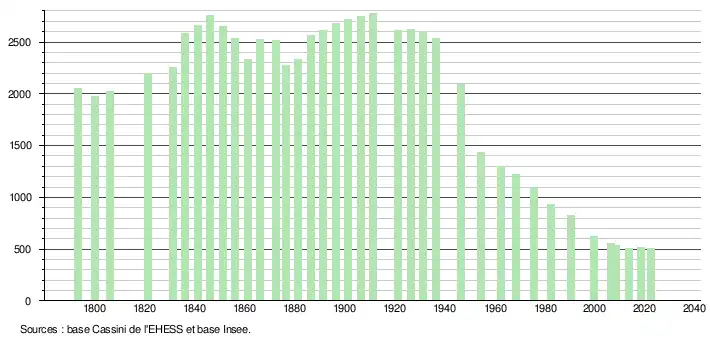 L'évolution du nombre d'habitants est connue à travers les recensements de la population effectués dans la commune depuis 1793. Pour les communes de moins de 10 000 habitants, une enquête de recensement portant sur toute la population est réalisée tous les cinq ans, les populations de référence des années intermédiaires étant quant à elles estimées par interpolation ou extrapolation[14]. Pour la commune, le premier recensement exhaustif entrant dans le cadre du nouveau dispositif a été réalisé en 2008[15].