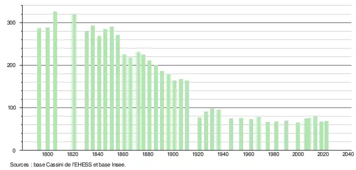 L'évolution du nombre d'habitants est connue à travers les recensements de la population effectués dans la commune depuis 1793. Pour les communes de moins de 10 000 habitants, une enquête de recensement portant sur toute la population est réalisée tous les cinq ans, les populations de référence des années intermédiaires étant quant à elles estimées par interpolation ou extrapolation[21]. Pour la commune, le premier recensement exhaustif entrant dans le cadre du nouveau dispositif a été réalisé en 2008[22].
