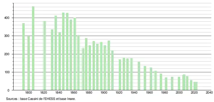 L'évolution du nombre d'habitants est connue à travers les recensements de la population effectués dans la commune depuis 1793. Pour les communes de moins de 10 000 habitants, une enquête de recensement portant sur toute la population est réalisée tous les cinq ans, les populations de référence des années intermédiaires étant quant à elles estimées par interpolation ou extrapolation[35]. Pour la commune, le premier recensement exhaustif entrant dans le cadre du nouveau dispositif a été réalisé en 2005[36].