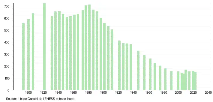 L'évolution du nombre d'habitants est connue à travers les recensements de la population effectués dans la commune depuis 1793. Pour les communes de moins de 10 000 habitants, une enquête de recensement portant sur toute la population est réalisée tous les cinq ans, les populations de référence des années intermédiaires étant quant à elles estimées par interpolation ou extrapolation[15]. Pour la commune, le premier recensement exhaustif entrant dans le cadre du nouveau dispositif a été réalisé en 2004[16].