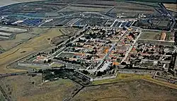 Vue aérienne du centre-ville avec l'église Saint-Pierre et les places de Verdun et Chasseloup-Laubat. | |||||