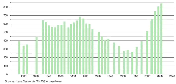 L'évolution du nombre d'habitants est connue à travers les recensements de la population effectués dans la commune depuis 1793. Pour les communes de moins de 10 000 habitants, une enquête de recensement portant sur toute la population est réalisée tous les cinq ans, les populations de référence des années intermédiaires étant quant à elles estimées par interpolation ou extrapolation[14]. Pour la commune, le premier recensement exhaustif entrant dans le cadre du nouveau dispositif a été réalisé en 2007[15].