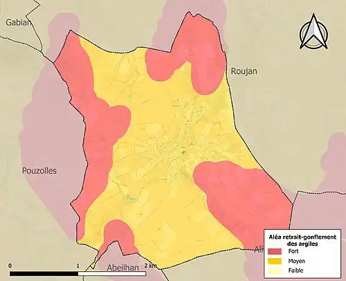 Le retrait-gonflement des sols argileux est susceptible d'engendrer des dommages importants aux bâtiments en cas d’alternance de périodes de sécheresse et de pluie. La totalité de la commune est en aléa moyen ou fort (59,3 % au niveau départemental et 48,5 % au niveau national). Sur les 340 bâtiments dénombrés sur la commune en 2019, 340 sont en aléa moyen ou fort, soit 100 %, à comparer aux 85 % au niveau départemental et 54 % au niveau national. Une cartographie de l'exposition du territoire national au retrait gonflement des sols argileux est disponible sur le site du BRGM[16],[Carte 2].