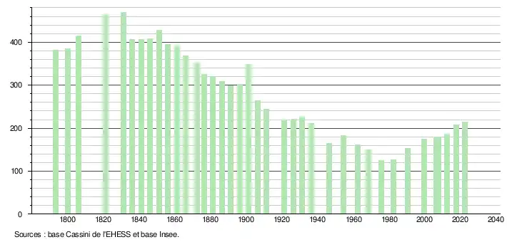 L'évolution du nombre d'habitants est connue à travers les recensements de la population effectués dans la commune depuis 1793. Pour les communes de moins de 10 000 habitants, une enquête de recensement portant sur toute la population est réalisée tous les cinq ans, les populations de référence des années intermédiaires étant quant à elles estimées par interpolation ou extrapolation[20]. Pour la commune, le premier recensement exhaustif entrant dans le cadre du nouveau dispositif a été réalisé en 2007[21].