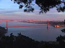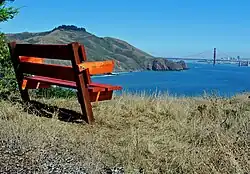 À l'endroit où la route Conzelman serpente sur la rive sud des Marin Headlands et devient à sens unique, un chemin pédestre mène au sommet de Hawk Hill. À une courte distance sur la droite, niché dans un bosquet de pins de Monterey, on peut trouver un banc permettant de contempler le Golden Gate, le trafic maritime sous le pont ainsi que la cité juste derrière.