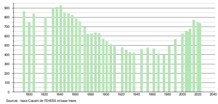 L'évolution du nombre d'habitants est connue à travers les recensements de la population effectués dans la commune depuis 1793. Pour les communes de moins de 10 000 habitants, une enquête de recensement portant sur toute la population est réalisée tous les cinq ans, les populations de référence des années intermédiaires étant quant à elles estimées par interpolation ou extrapolation[23]. Pour la commune, le premier recensement exhaustif entrant dans le cadre du nouveau dispositif a été réalisé en 2004[24].
