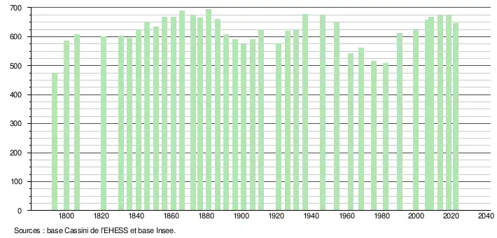 L'évolution du nombre d'habitants est connue à travers les recensements de la population effectués dans la commune depuis 1793. Pour les communes de moins de 10 000 habitants, une enquête de recensement portant sur toute la population est réalisée tous les cinq ans, les populations de référence des années intermédiaires étant quant à elles estimées par interpolation ou extrapolation[27]. Pour la commune, le premier recensement exhaustif entrant dans le cadre du nouveau dispositif a été réalisé en 2008[28].
