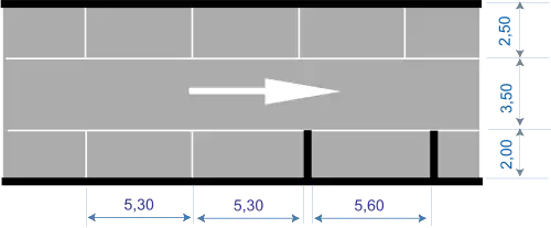 Dans le cas où le stationnement se fait en épi ou perpendiculaire, les limites sont matérialisées à l’aide des lignes de couleur blanches, continues de largeur 2 u ou discontinues de type T’2 de largeur 2u ou simplement amorcées[2].