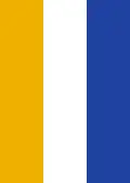 dérive : reprise du drapeau national : en trois bandes verticales: gauche en rouge, droite en vert, centre plus large en, blanc avec un blason en écu divisé en deux parties horizontales : partie haute en blanc sur la gauche un écu vert bordé or avec une fleur de lys en or, sur la droite un écu rempli en damier blanc/rouge, partie basse en bleu avec 10 étoiles blanches à 6 branches en cercle.