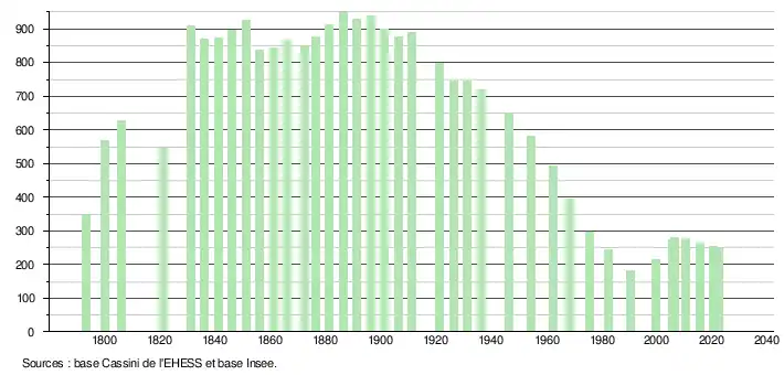 L'évolution du nombre d'habitants est connue à travers les recensements de la population effectués dans la commune depuis 1793. Pour les communes de moins de 10 000 habitants, une enquête de recensement portant sur toute la population est réalisée tous les cinq ans, les populations de référence des années intermédiaires étant quant à elles estimées par interpolation ou extrapolation[21]. Pour la commune, le premier recensement exhaustif entrant dans le cadre du nouveau dispositif a été réalisé en 2005[22].