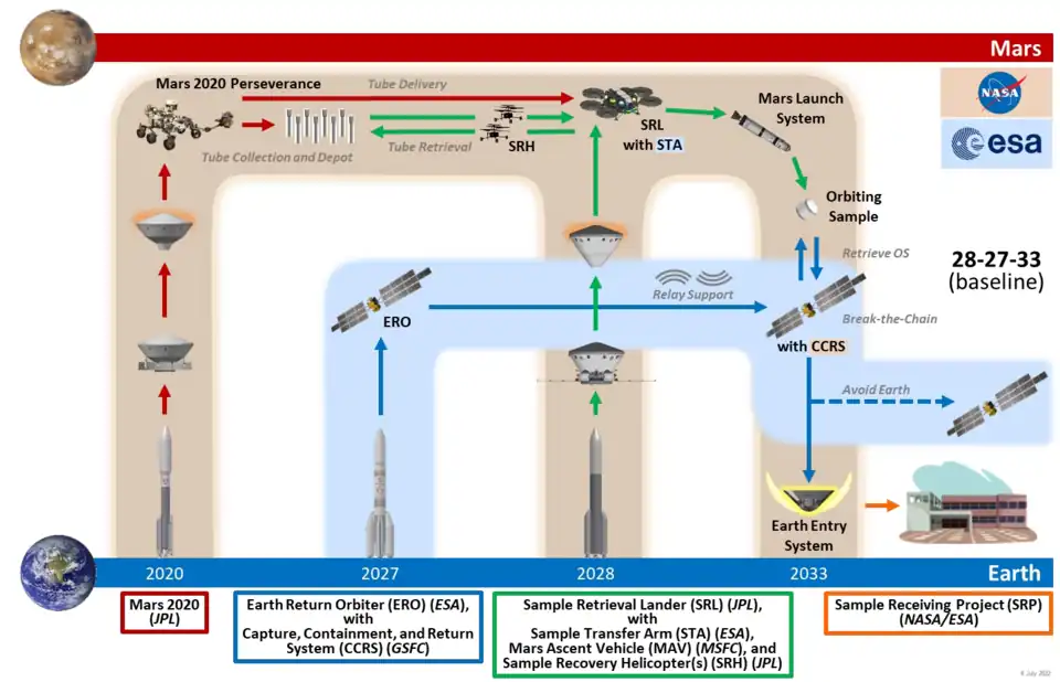 Selon le scénario en vigueur en , les deux sondes spatiales développées respectivement par la NASA et l'Agence spatiale européenne doivent être lancées en 2026 dans le but de récupérer les échantillons de sol déposés sur Mars par l'astromobile Perseverance et les ramener sur Terre en 2031[14].