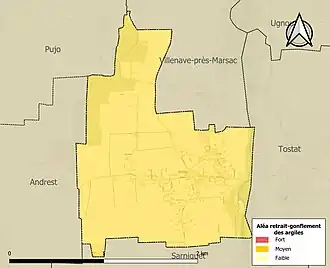 Le retrait-gonflement des sols argileux est susceptible d'engendrer des dommages importants aux bâtiments en cas d’alternance de périodes de sécheresse et de pluie. La totalité de la commune est en aléa moyen ou fort (44,5 % au niveau départemental et 48,5 % au niveau national). Sur les 110 bâtiments dénombrés sur la commune en 2019, 110 sont en aléa moyen ou fort, soit 100 %, à comparer aux 75 % au niveau départemental et 54 % au niveau national. Une cartographie de l'exposition du territoire national au retrait gonflement des sols argileux est disponible sur le site du BRGM[23],[Carte 3].