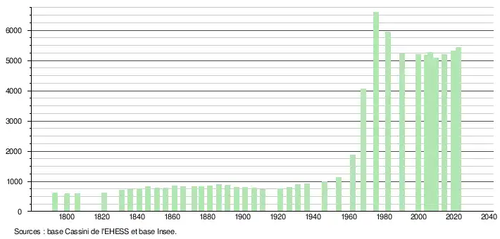 L'évolution du nombre d'habitants est connue à travers les recensements de la population effectués dans la commune depuis 1793. Pour les communes de moins de 10 000 habitants, une enquête de recensement portant sur toute la population est réalisée tous les cinq ans, les populations de référence des années intermédiaires étant quant à elles estimées par interpolation ou extrapolation[17]. Pour la commune, le premier recensement exhaustif entrant dans le cadre du nouveau dispositif a été réalisé en 2004[18].
