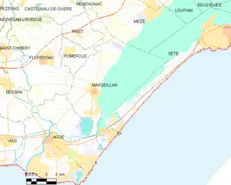 Marseillan est une ville du Languedoc, située à 13,3 km de Sète et à 6,5 km d'Agde[1]. Elle appartient au canton d'Agde, à l'arrondissement de Montpellier et fait partie des communes qui bordent l'étang de Thau. La ville compte 7 734 habitants à l’année, mais voit sa population largement augmenter durant la période estivale : elle est multipliée par dix et atteint 60 000 habitants durant cette période[2]. Le territoire marseillanais est relativement plat.