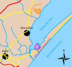 Le canal de Pisse-Saumes relie l'étang de Thau à la Méditerranée[7] et c'est autour de son embouchure que s'articule Marseillan-Plage[8].
