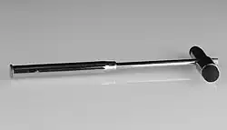 - Le marteau de Queen Square fut mis au point vers 1925 au National Hospital for Nervous Diseases (à présent le National Hospital for Neurology and Neurosurgery) de Queen Square à Londres, par l'infirmière chargée du matériel d'électrothérapie, Miss Wintle surnommée « Sister Electrical » (« Sœur électrique »)[6]. Il se composait à l'origine d'un manche en bambou ou en canne, d'une longueur comprise entre 25 et 40 centimètres, fixé à un disque métallique cerclé de gomme ressemblant à celui du modèle de Babinski-Rabiner, mais en fait dérivé d'un modèle britannique plus ancien, celui de Henry Vernon, dont la tête était une sphère entourée d'une bande de caoutchouc[7]. Le marteau de Queen Square possède actuellement un manche en plastique souple et souvent terminé en pointe mousse ce qui permet également la recherche des réflexes cutanés. C'est le marteau le plus utilisé en Grande-Bretagne.