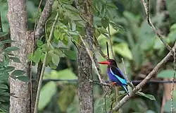 Le Martin-chasseur de Java peut atteindre une taille de 27 cm. Il possède un imposant bec rouge, une calotte noire, une poitrine lilas et des ailes bleu-clair. Il est très actif dans les rizières.