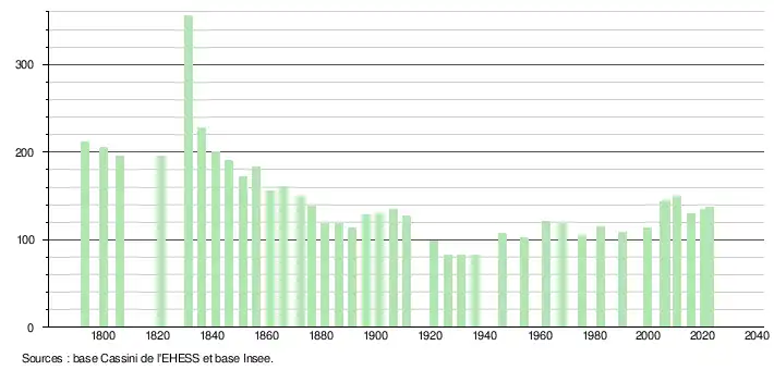 L'évolution du nombre d'habitants est connue à travers les recensements de la population effectués dans la commune depuis 1793. Pour les communes de moins de 10 000 habitants, une enquête de recensement portant sur toute la population est réalisée tous les cinq ans, les populations de référence des années intermédiaires étant quant à elles estimées par interpolation ou extrapolation[29]. Pour la commune, le premier recensement exhaustif entrant dans le cadre du nouveau dispositif a été réalisé en 2005[30].