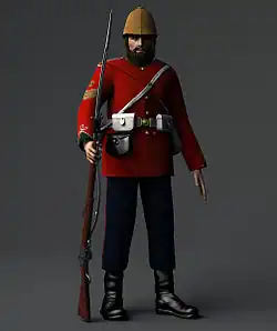 Guerre anglo-zouloue. Concomitante du désastre d'Isandhlwana, la résistance victorieuse de 150 red-coats face à des milliers de Zoulous lors de la bataille de Rorke's Drift fut illustrée par l'imagerie populaire et conforta le moral de nombreux Britanniques. On voit à droite un troupier, tête-nue, face à l'ennemi, tendant la main pour recevoir la cartouche que lui passe un de ses amis blessés : il va pouvoir charger la chambre vide de son fusil Martini-Henry, qui a le levier d'armement baissé; la plupart des Martini-Henry ont la baïonnette au canon, et trois d'entre eux sont vigoureusement maniés de haut en bas du parapet. Au premier plan à droite, deux grosses sagaies (iklwas) lancées par les Zoulous.- Deuxième guerre anglo-afghane, bataille de Peiwar Kotal (victoire britannique, ). Les soldats du King's Own Royal Regiment montent à l'assaut des hauteurs de la passe de Peiwar Kotal. Les Martini-Henry sont fidèlement représentés : levier de sous-garde, pas de chien externe.