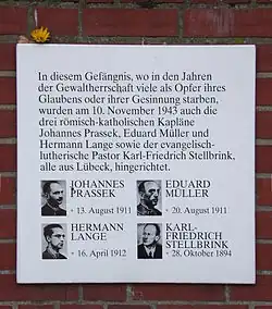 - ↑ Bienheureux Johannes Prassek, Eduard Müller et Hermann Lange, prêtres martyrs de Lübeck († 1943), fête le 10 novembre, Nominis.