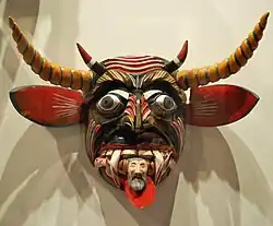 Cependant, les masques fantastiques les plus courants sont ceux qui représentent les démons et Satan lui-même[45]. Ceux-ci varient de visages humains presque normaux à ceux présentant des traits sauvages et / ou grotesques, avec des traits humains, des traits d'animaux ou les deux[31],[63]. Les représentations d'anciens dieux pré hispaniques restent masquées. Tlaloc est communément décrit comme ayant des serpents autour des yeux et des crocs de vipère. Ces éléments peuvent être trouvés dans les masques du diable aujourd'hui. Tezcatlipoca est un dieu de la nuit aux couleurs noir et rouge. Ceux-ci sont également appliqués aux masques du diable[63].