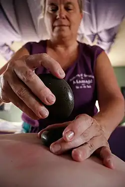 Certains massages utilisant des pierres peuvent également utiliser des pierres froides, généralement faites de marbre et placées dans un bol d'eau glacée avant leur utilisation[réf. nécessaire].