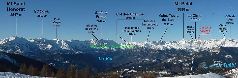 Il est entouré au nord et à l'est par le massif du Mercantour-Argentera (auquel il est parfois rattaché), au sud par les Préalpes de Castellane et à l'ouest par le massif des Trois-Évêchés.