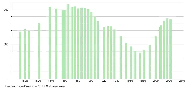 L'évolution du nombre d'habitants est connue à travers les recensements de la population effectués dans la commune depuis 1793. Pour les communes de moins de 10 000 habitants, une enquête de recensement portant sur toute la population est réalisée tous les cinq ans, les populations de référence des années intermédiaires étant quant à elles estimées par interpolation ou extrapolation[8]. Pour la commune, le premier recensement exhaustif entrant dans le cadre du nouveau dispositif a été réalisé en 2007[9].