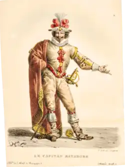 Comme le Capitan, c'est une des formes du Miles gloriosus de Plaute, soldat fanfaron, se targuant d'exploits qu'il n'a pas réalisés et qui au fond n'est qu'un poltron.