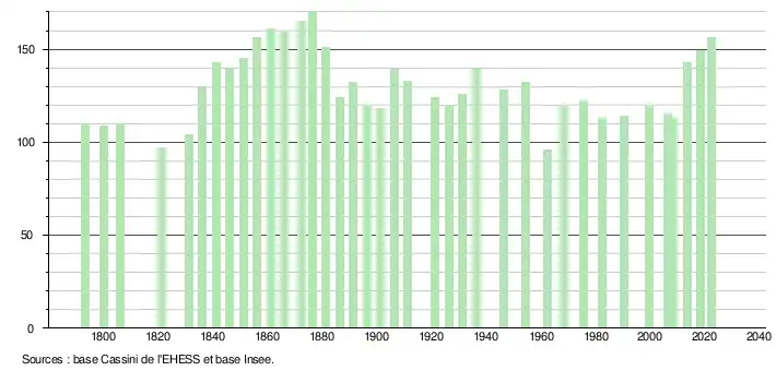 L'évolution du nombre d'habitants est connue à travers les recensements de la population effectués dans la commune depuis 1793. Pour les communes de moins de 10 000 habitants, une enquête de recensement portant sur toute la population est réalisée tous les cinq ans, les populations de référence des années intermédiaires étant quant à elles estimées par interpolation ou extrapolation[31]. Pour la commune, le premier recensement exhaustif entrant dans le cadre du nouveau dispositif a été réalisé en 2008[32].