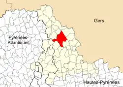 Elle se situe à 27,7 km par la route[Note 1] au nord-ouest de Tarbes[1], préfecture du département, et à 140 km au sud-ouest de la capitale régionale, Toulouse[2], et à 775 km au sud-ouest de la capitale, Paris[3]. La commune est par ailleurs ville-centre du bassin de vie de Maubourguet[I 1].