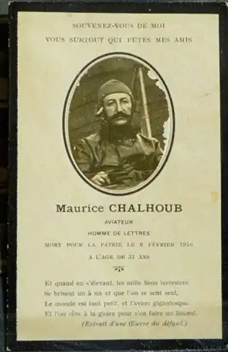 Après être passé au premier groupe d'aviation à Dijon, il arrive comme élève pilote le à l'École d'aviation militaire d'Étampes[14]. Alors que l'aviation en est à ses débuts en 1914, les militaires y trouvent de l'intérêt pour la reconnaissance aérienne et les bombardiers. Chalhoub meurt accidentellement en service, le , à la suite de la chute de son avion de 2 400 m lors de sa dernière phase de pilotage à l'épreuve de hauteur[30].