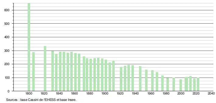 L'évolution du nombre d'habitants est connue à travers les recensements de la population effectués dans la commune depuis 1800. Pour les communes de moins de 10 000 habitants, une enquête de recensement portant sur toute la population est réalisée tous les cinq ans, les populations de référence des années intermédiaires étant quant à elles estimées par interpolation ou extrapolation[21]. Pour la commune, le premier recensement exhaustif entrant dans le cadre du nouveau dispositif a été réalisé en 2007[22].
