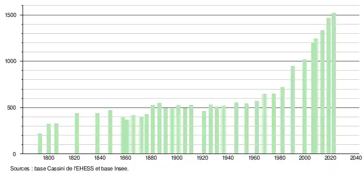 L'évolution du nombre d'habitants est connue à travers les recensements de la population effectués dans la commune depuis 1793. Pour les communes de moins de 10 000 habitants, une enquête de recensement portant sur toute la population est réalisée tous les cinq ans, les populations de référence des années intermédiaires étant quant à elles estimées par interpolation ou extrapolation[12]. Pour la commune, le premier recensement exhaustif entrant dans le cadre du nouveau dispositif a été réalisé en 2008[13].