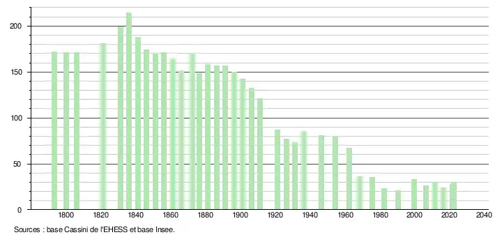 L'évolution du nombre d'habitants est connue à travers les recensements de la population effectués dans la commune depuis 1793. Pour les communes de moins de 10 000 habitants, une enquête de recensement portant sur toute la population est réalisée tous les cinq ans, les populations de référence des années intermédiaires étant quant à elles estimées par interpolation ou extrapolation[35]. Pour la commune, le premier recensement exhaustif entrant dans le cadre du nouveau dispositif a été réalisé en 2006[36].