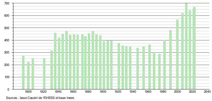 | L'évolution du nombre d'habitants est connue à travers les recensements de la population effectués dans la commune depuis 1793. Pour les communes de moins de 10 000 habitants, une enquête de recensement portant sur toute la population est réalisée tous les cinq ans, les populations de référence des années intermédiaires étant quant à elles estimées par interpolation ou extrapolation[24]. Pour la commune, le premier recensement exhaustif entrant dans le cadre du nouveau dispositif a été réalisé en 2006[25]. En 2022, la commune comptait 670 habitants[Note 2], en évolution de +4,2 % par rapport à 2016 (Landes : +5,78 %, France hors Mayotte : +2,11 %). |