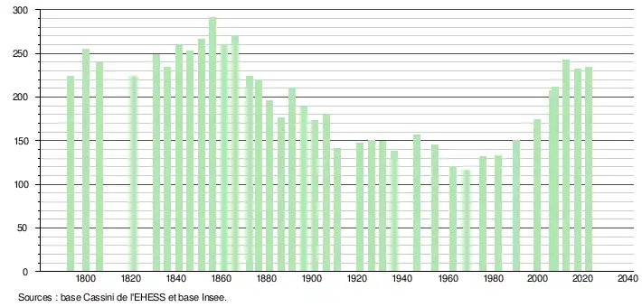 L'évolution du nombre d'habitants est connue à travers les recensements de la population effectués dans la commune depuis 1793. Pour les communes de moins de 10 000 habitants, une enquête de recensement portant sur toute la population est réalisée tous les cinq ans, les populations de référence des années intermédiaires étant quant à elles estimées par interpolation ou extrapolation[40]. Pour la commune, le premier recensement exhaustif entrant dans le cadre du nouveau dispositif a été réalisé en 2007[41].