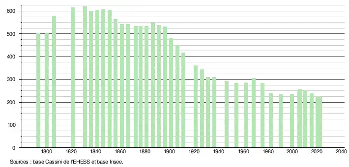 L'évolution du nombre d'habitants est connue à travers les recensements de la population effectués dans la commune depuis 1793. Pour les communes de moins de 10 000 habitants, une enquête de recensement portant sur toute la population est réalisée tous les cinq ans, les populations de référence des années intermédiaires étant quant à elles estimées par interpolation ou extrapolation[19]. Pour la commune, le premier recensement exhaustif entrant dans le cadre du nouveau dispositif a été réalisé en 2005[20].