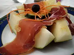 Le melon au jambon est une spécialité que l'on retrouve en France, Espagne et Italie[1],[2], et qui est habituellement servie au printemps, ou en été. Les ingrédients principaux sont du melon et des tranches de jambon cru. La finesse de ce plat est dans le mélange sucré du melon avec le salé du jambon.