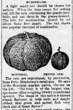 - ↑ « The Montreal Musk Melon Industry », Experiment station work, XLIX, Farmers Bulletin 342, US Dept. of Agriculture, no 11 janvier 1909, (lire en ligne, consulté le )