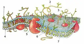 Les membranes plasmiques contiennent également des glucides, essentiellement sous forme de glycoprotéines, avec une petite fraction de glycolipides, tels que cérébrosides et gangliosides. Ces glucides jouent un rôle prépondérant dans la reconnaissance intercellulaire (en) chez les eucaryotes. Ils sont localisés sur la surface de la cellule, d'où ils permettent l'identification de la cellule et la transmission d'informations. Un virus qui se lie à une cellule hôte à l'aide de tels récepteurs peut y provoquer une infection[6]. La glycosylation se produit presque exclusivement sur la face extérieure de la membrane plasmique. Le glycocalyx est une structure importante des cellules, notamment celles de l'épithélium avec microvillosités, et pourrait être impliqué dans l'adhérence cellulaire, la migration des lymphocytes[6] et bien d'autres processus. L'ose terminal est un acide sialique et l'avant-dernier est un résidu de galactose, tandis que le squelette osidique est mis en forme dans l'appareil de Golgi. L'acide sialique porte une charge électrique négative, ce qui lui confère un rôle de barrière contre les particules chargées.
